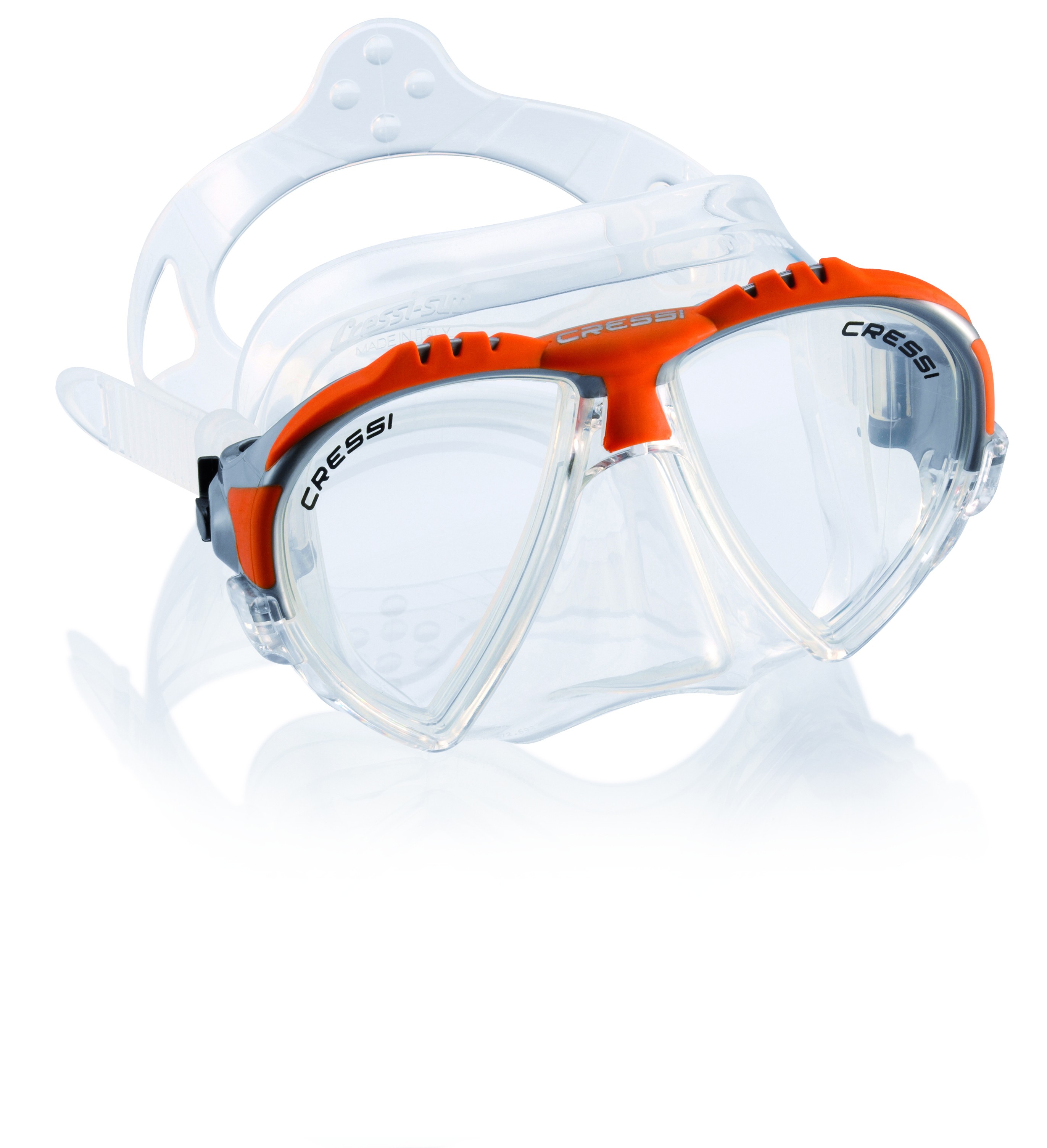 Not only has this new Cressi Crystal Silicone been chosen, with its exceptional softness and comfort, but the entire design of the skirt has followed new rules which allow a point of contact between the mask and the face that has a very open angle.